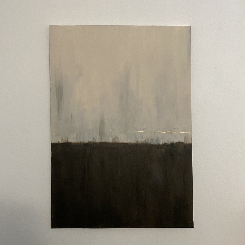 The painting is divided in two parts. The superior part is beige blended with grey. The lower part symbolises death and it is painted with metallic acrylic paint that is highly visible with some direct light.